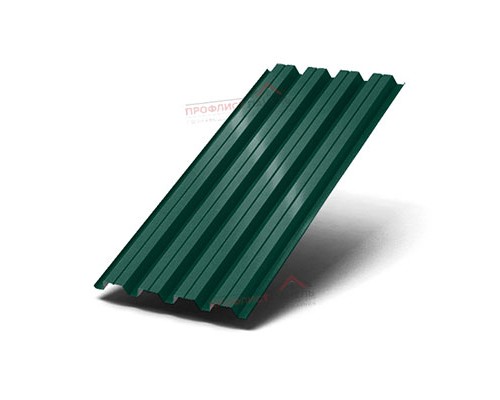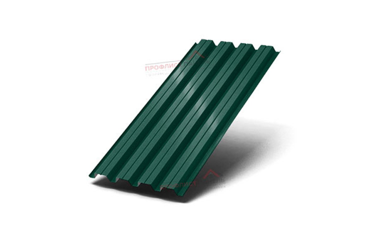 Лист имеет трапециевидную геометрию и защитную систему полимерное покрытие на основе полиэстера. В маркировке указан оттенок RAL6005, что важно при согласовании с фасадной или кровельной палитрой. Такой набор параметров учитывают при оценке коррозионной стойкости, температурной подвижности и совместимости с доборными элементами.