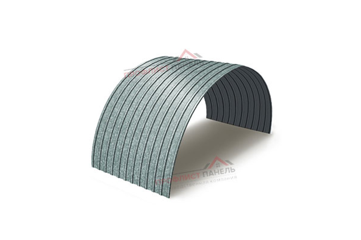 Обозначение ПГ в маркировке означает продольно гнутый профиль, то есть арочное исполнение профнастила. Такой лист применяют в криволинейных покрытиях, навесах, укрытиях и других конструкциях, где важна работа по радиусу. Маркировка не относится к сэндвич-панели: утеплитель в составе не предусмотрен, материал работает как однослойная облицовка или ограждение. Цинковое покрытие работает как базовая защита металла и обычно применяется там, где цветовая спецификация не является определяющей. В конструктивной схеме лист работает как тонкостенный холодногнутый элемент.