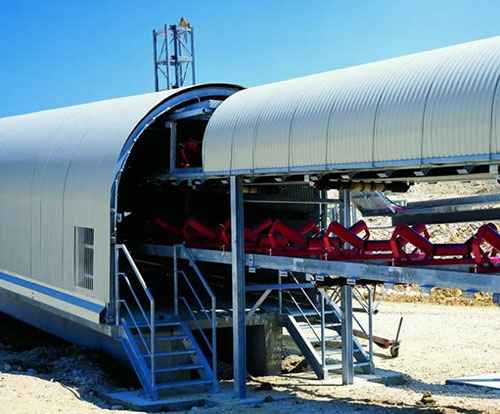 Применяются для укрытия транспортных линий между дробилками, сортировочными установками и складами готового материала. Такие укрытия предотвращают потери сыпучей продукции, улучшают условия труда и снижают загрязнение окружающей среды.